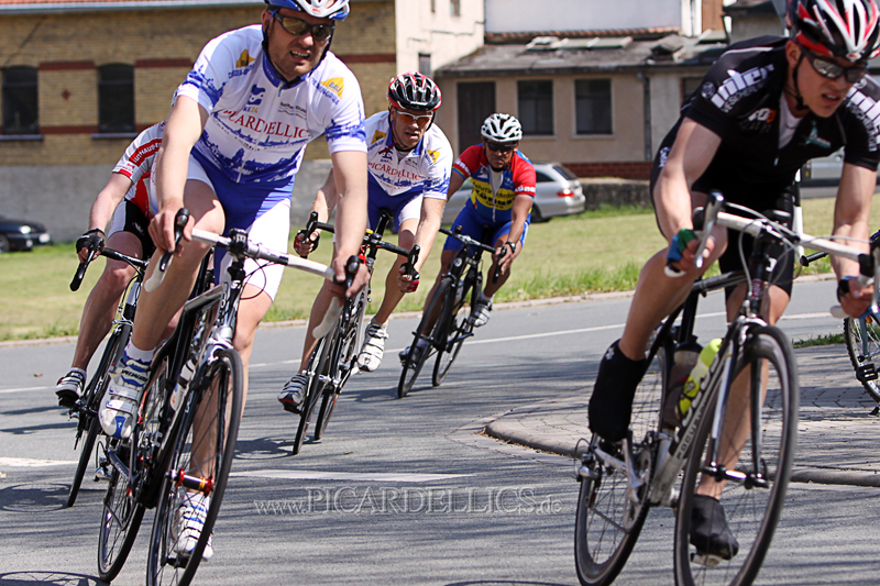 Zehn Sekunden waren zu wenig um sich dauerhaft vom Feld abzusetzen und so wurden die drei Mädels und die östrogengepeinigten Levriers schnell vom heranjagenden Feld eingeholt. Neff-Grün dominierte dabei das Feld. Selbst die in sehr großer Zahl angereisten Picardellics konnten nur einzelne Farb- und Geschwindigkeitstupfer gegen die allgegenwärtige grüne Übermacht setzen. Offensichtlich hatte Neff nahezu jeden Thüringer in ein grünes Trikot gezwängt und aufs Rad gesetzt. Und wer von den Thüringern nicht radfahren konnte, mußte seinen Sonntag DKV-Fahnenschwenkend an der Strecke verbringen.